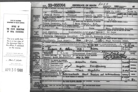 Lenora Alice Death Cert. And Headstone